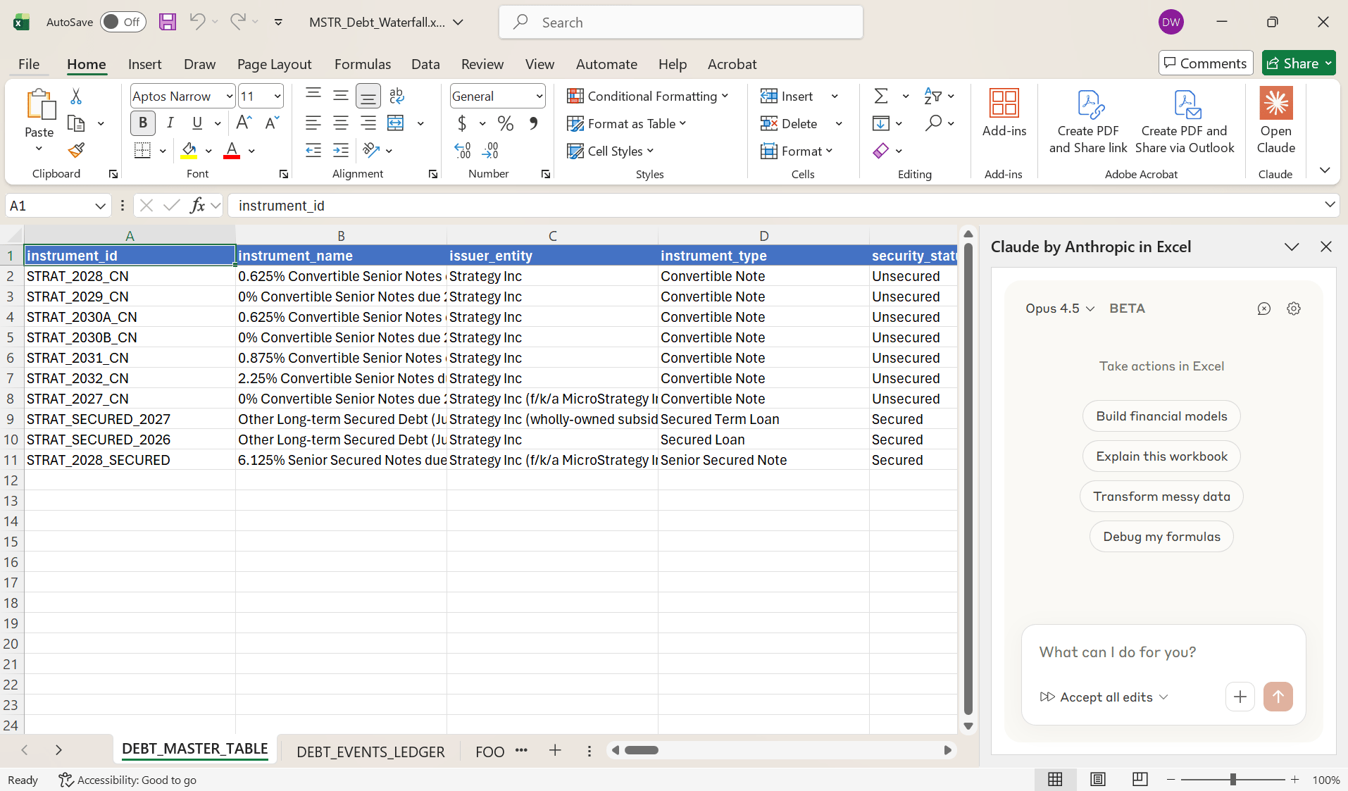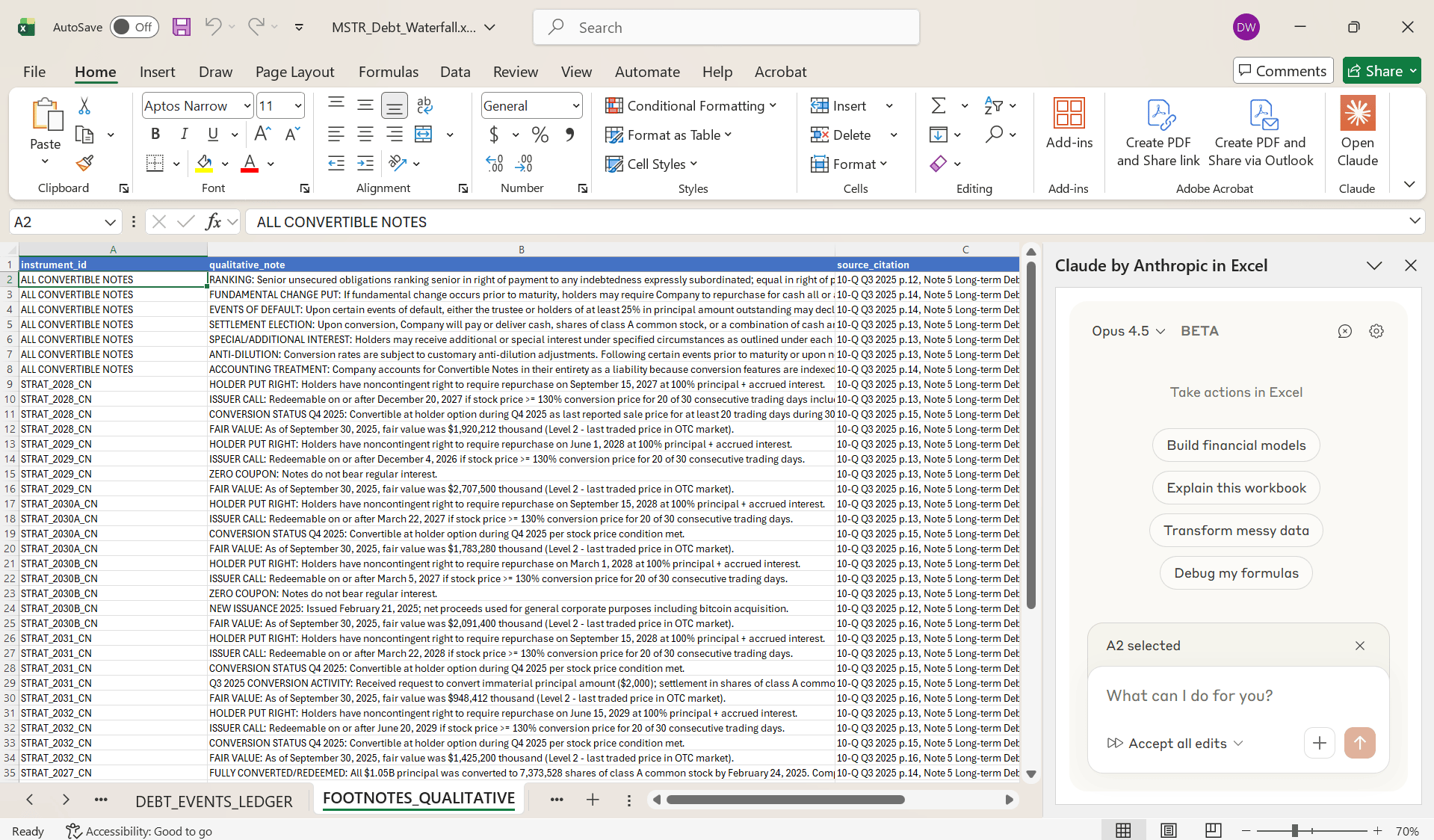 The ResultFull output here: MSTR_Debt_Waterfall.xlsx Claude for Excel produced a four-tab workbook in one pass: Tab 1: Debt Master Table: Every debt instrument mapped across 38 columns. Principal amounts, maturity dates, coupon rates, conversion prices, put dates, call conditions, settlement methods, ranking in the capital structure. All sourced and cited to the specific page in the 10-Q. Tab 2: Debt Events Ledger: A chronological log of every debt event. Issuances, redemptions, conversions. Cash paid or received. Accounting impact. This is the audit trail you need to understand how the debt stack evolved. Tab 3: Qualitative Footnotes: The nuanced language that matters. Fundamental change definitions. Anti-dilution provisions. Events of default triggers. The stuff that’s easy to miss when you’re manually scanning footnotes. Tab 4: Open Items: This is the part that impressed me most. Claude flagged what’s NOT in the filing. Missing covenant details. Undisclosed collateral descriptions. Cross-default provisions that would require pulling the original indentures. In other words, it’s not just extracting data. It’s telling you where the gaps are in your diligence. The Bigger PictureThis workflow fundamentally changes how you can approach credit analysis. Think about the typical process. You pull the 10-Q. You ctrl+F for “debt” and “notes payable.” You manually build a table in Excel. You cross-reference three different footnotes to figure out the put date on one tranche. You miss the conversion rate adjustment language buried on page 47. Now you can upload the filing, run one prompt, and get a structured output that would have taken hours to build manually. A few things I’d highlight: