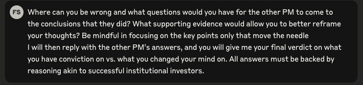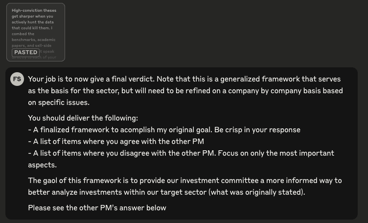 You’re probably using ChatGPT for investment research. Maybe Claude too. But you’re treating them like glorified research assistants when you should be treating them like committee members. Look, they can both search the web, conduct research, and think more critically than most junior analysts. But here's how you can level up: I've been speaking to a lot young PMs lately, and the one thing that caught my attention is that they make their AIs debate each other. It’s like having a real-time investment committee where Claude, ChatGPT, and even different instances of the same model all contribute based on what they are strongest at. One focused on investment frameworks, another on data retrieval, another on qualitative research, and so on. This is how you avoid the confirmation bias from using a single LLM, which would tank your returns. The Confirmation Bias Problem That’s Costing You AlphaHere’s the thing about LLMs: they’re sophisticated yes-men. Feed them your investment thesis and they’ll build you a compelling case. Ask for risks and they’ll find manageable, hedge-able concerns. Sound familiar? It’s exactly like telling your fresh out-of-Wharton junior analyst to build an IC memo on an opportunity. They’ll do a great job, but will probably show you what you want to see (until you train them to seek the truth). We'd all rather make money than miss the blind spots because we are being appeased to. You shouldn't battle your AI models for simple stuff like pulling earnings dates, market caps, or running standard comps. But when you’re dealing with complex investment decisions that require research and reasoning, you need your AIs to challenge each other. Here’s exactly how this works in practice. My AI Investment Committee SetupI always start with ChatGPT o3 as my quarterback. OpenAI is better as the high-level architect because it has deep memory of our previous conversations, I’ve built custom instructions trained on my investment style, and it has the best reasoning at a macro level. Here’s a real example of how I put it to work: For this level of analysis, o3 plus search gives you the best reasoning capabilities. TLDR, here’s what came back: