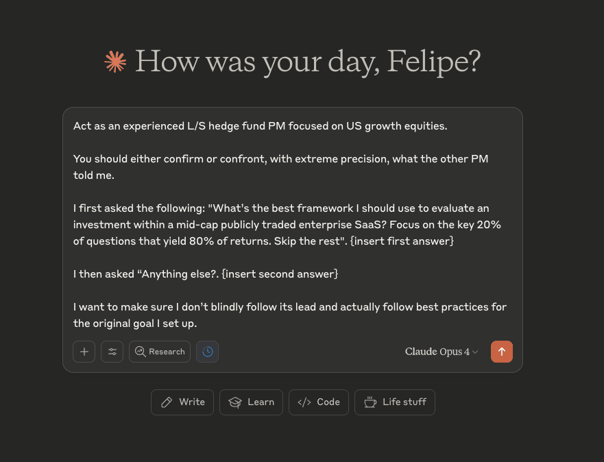 Most of this doesn’t really matter for public equities analysis. So I asked my second committee member with a funny French name: Claude. Bringing In the ContrarianI copy ChatGPT’s analysis and prompt Claude Opus 4.0: Claude came back swinging: Now this is what I’m talking about. Real intellectual rigor, challenging the other PM. Claude peeled back several layers that ChatGPT missed, found holes in the argument, and provided more nuanced context. The beauty is that it debates with logic, like two investors "seeking the truth" vs. fighting for political power. And this was much more powerful than if I had just prompted Claude from scratch. Making Them Fight Each OtherNow I suspected they were both missing something. They were focusing on their initial frameworks instead of getting to what really matters. So I pushed Claude further: After some back and forth, I provided ChatGPT’s response and asked Claude for a final verdict: Here’s what’s interesting: ChatGPT functions like my high-level architect that can think about what matters, but Claude is a much better closer and more opinionated. ChatGPT is that really smart investor who knows how to analyze investments but won’t give you a clean answer on what action to take because he’s trying not to look dumb. Claude is more opinionated, really smart, but needs the right inputs to finalize decisions. You could say ChatGPT is the analyst, Claude is the PM making the calls with yes/no answers. Claude’s final synthesis. Pretty good for a beginner, but Bill Ackman would probably have much more of a secret sauce. Your Copy-Paste Battle FrameworkHere's my attempt at an evergreen template for any situation. Step 1: Primary analysis with ChatGPT o3 (always enable web search) Step 2: Challenge with Claude using this prompt: Act as a [contrarian analyst/risk manager/sector specialist]. I want you to challenge this investment analysis with institutional-grade precision. Original question: [your investment question] I’m attaching the first analysis. Find the holes, challenge assumptions, identify blind spots. I need to make sure I’m not falling into confirmation bias on a [position size] position. Step 3: Battle until consensus or clear disagreement emerges Advanced Move: Use the same prompt on parallel conversations when testing complex theses. Compare answers. Challenge the weaker analysis with the stronger one. Why Financial AIs “Hallucinate”LLMs don’t necessarily provide incorrect information; they just regurgitate a bunch of information without judgment of what really matters. If you're an institutional investor, you definitely want to be prompting more of your secret sauce to help refine the model with your way of thinking. This can get you better results that more align with your own investment philosophy. The training problem: Models learn to sound authoritative, not to be right. In finance, sounding smart and being profitable are very different things. Jim Simons always said ”We never override the computer.” The thing is, LLMs are not deterministic; for every input, you really don't know what you're going to get. So you need to feel free to override and challenge the model. For those of you worried about AI taking your jobs, this is one of the reasons AI can't replace you. Quick Anti-Hallucination ChecklistWhen you catch yourself nodding along with everything an AI tells you, you need to get it to be controversial: