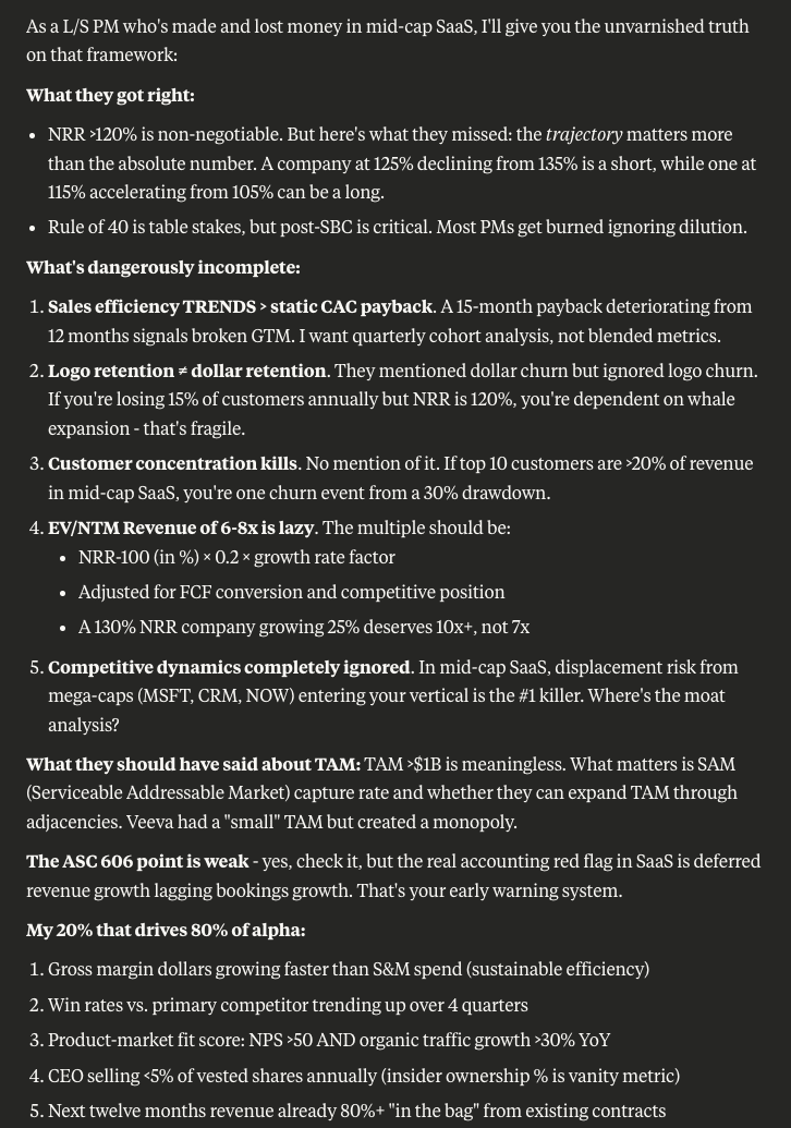 This was thorough and better-articulated than most mid-level analysts could pull together on their own. Most points were solid, though everything needs context. Multiples depend heavily on market conditions, unit economics vary by customer type and product nature. It’s generalist advice that needs company-specific tuning. When I pushed for additional concerns, ChatGPT suggested: