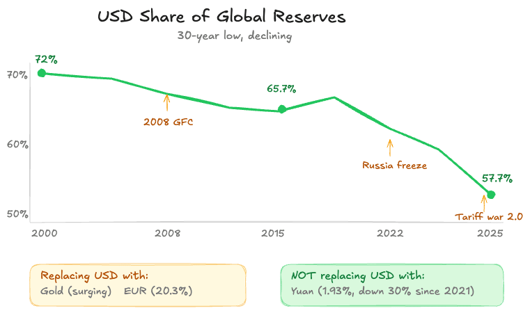 Part 1: Where is the money actually going?The Prompt Prompt 1: https://www.finprompter.com/share/abd958bf-9df1-42ab-b6d3-e1b0aaef50e8 The Result: Full output here: https://claude.ai/public/artifacts/c7ffab9c-22bb-41e4-b9a2-e3d3a31f3f0a The biggest finding: the headline number is misleading. Everyone quotes the $634B selldown. But China doesn’t hold all its Treasuries under its own name. It routes a large portion through custodian banks in Belgium and Luxembourg. Think of it like buying a house through an LLC. You own it, but your name isn’t on the public record. The Treasury’s own data: Belgium went from $374.6B to $481.0B in one year (+28%). Over that same window, China’s direct holdings fell from $759.0B to $682.6B. If China is truly “dumping,” why are the custody hubs surging? AI also flagged China rotating into US agency bonds (Fannie Mae, Freddie Mac). Still dollar assets, just a different instrument. The real picture: China’s total dollar exposure has barely changed at ~$1.8 trillion. The money moved from Treasuries to agencies, from US custodians to European custodians, and from long-term bonds to short-term bonds. A reshuffling within the dollar system, not an exit from it. So what is actually changing? Gold. That’s the real structural shift. The PBOC has been buying for 15 straight months. Official holdings: 2,307 tonnes. But AI flagged multiple independent estimates converging on actual holdings of 4,000-5,400 tonnes … potentially 2-3x what’s reported. European government bonds are the second destination. The euro’s share of global reserves hit 20.3%, highest since late 2022. And for what it’s worth: the yuan’s share has actually declined 30% since 2021. The world isn’t replacing dollars with yuan. It’s replacing them with gold. Part 2: How could you position?The Prompt Prompt 2: https://www.finprompter.com/share/7d2e282b-d553-4cd3-887b-fea787d7c4f6 The Result: Full output here: https://claude.ai/public/artifacts/04add324-f7f8-453c-8519-a23e2cc400c3 AI stress-tested the research against three scenarios: steady diversification (55%), geopolitical acceleration (20%), and a US-China deal that stabilizes things (25%). From the full menu of 10 trade ideas, here are three worth exploring. Idea #1: Long gold and gold miners (GLD, IAU, GDX, GDXJ). Central banks have been buying 1,000+ tonnes per year for four consecutive years. The buyer isn’t price-sensitive. They’re buying for geopolitical insurance, not returns. That creates a demand floor different from previous gold cycles. Gold is 8-9% of China’s reserves. The global average is 15-17%. The US and Germany hold 78%. That gap suggests a potential multi-year buying runway. Gold miners are particularly interesting here because mining costs are mostly fixed (~$1,400-1,600/oz) while revenue scales with gold price. If gold stays elevated, miners could see outsized margin expansion that hasn’t fully shown up in valuations yet. Key risk: if the yuan weakens and the PBOC sells reserves to defend the currency (the 2015-2016 playbook), gold could correct meaningfully. Idea #2: Treasury curve steepener (Long 2Y / Short 30Y). A “curve steepener” profits when the gap between short-term and long-term yields gets wider. Two forces could push in the same direction: Fed cuts pull the short end lower, while China selling long-dated Treasuries + expanding US deficits could push the long end higher. Key risk: a recession scare driving flight to safety into long-dated bonds. Idea #3: Dollar weakness (UDN, FXE). The dollar’s share of global reserves is at a 30-year low (57.7%). But DXY has already fallen ~10% from late 2024 peaks. Much of the move may be priced in. Three consensus traps worth flaggingTrap #1: “Sell all your Treasuries because China is dumping.” As covered above, China’s total dollar exposure is roughly stable at $1.8T. The Belgium TIC number ($481B, up $120B in one year) is the tell. The real question isn’t whether China is leaving the dollar. It’s where within the dollar complex flows are shifting. That’s why the steepener may be more interesting than an outright short. Trap #2: “Go long yuan assets because China is de-dollarizing.” This sounds logical but the data says the opposite. The yuan’s share of global reserves has fallen from 2.8% to 1.93% since 2021. Even China’s own allies aren’t stockpiling yuan. Capital controls, limited convertibility, and geopolitical risk make the yuan a poor reserve asset. China is diversifying away from dollars, but the rest of the world is not diversifying toward yuan. Trap #3: “Gold is a bubble at these levels.” The “bubble” framing assumes the buyer is speculative. But the marginal buyer here is central banks with multi-decade time horizons who don’t care about the price. That’s structurally different from 2011 when gold was driven by retail and ETF flows. Could gold correct? Absolutely, especially if we get a US-China deal. But calling it a bubble misidentifies who’s driving the demand. Bottom lineThe market is treating this as a “sell bonds, buy gold” story. It’s more nuanced than that. Gold and gold miners may have the most direct connection to the sovereign flow thesis. The curve steepener is worth studying. And several popular trades around this theme could be based on incomplete data. Try Prompt 1 on Japan. Largest foreign holder at $1.2T, and Japanese insurers are already repatriating capital. Same prompt, different sovereign. PersonalJust got back from a road show across Asia. The AI hype in finance over there is very real. Everyone I met is actively ramping up + PMs, analysts, ops teams. Impressive effort. It got me curious. Where are you based? What brought you to this newsletter? Hit reply and tell me a bit about yourself. Always great to know who I'm writing for. |