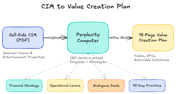 Private equity firms spend weeks building post-acquisition value creation plans. Teams of operating partners, consultants, and analysts pore over data rooms, build models, and debate strategy before presenting a board-level plan. It’s one of the most labor-intensive exercises in the PE workflow. But what if an AI could generate that entire plan from a single document? What does the first 100 days look like for a newly acquired portfolio company? Where are the margin expansion levers hiding in the CIM? Which analogous deals worked and which ones blew up? I’m going to show you how to turn a sell-side CIM into a full post-acquisition value creation plan using AI. The PlanHere’s the plan: