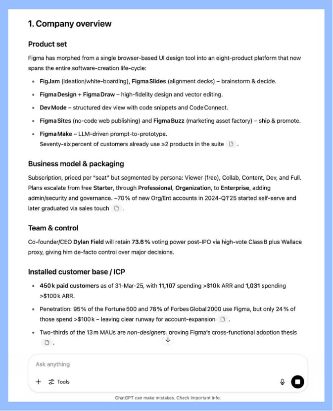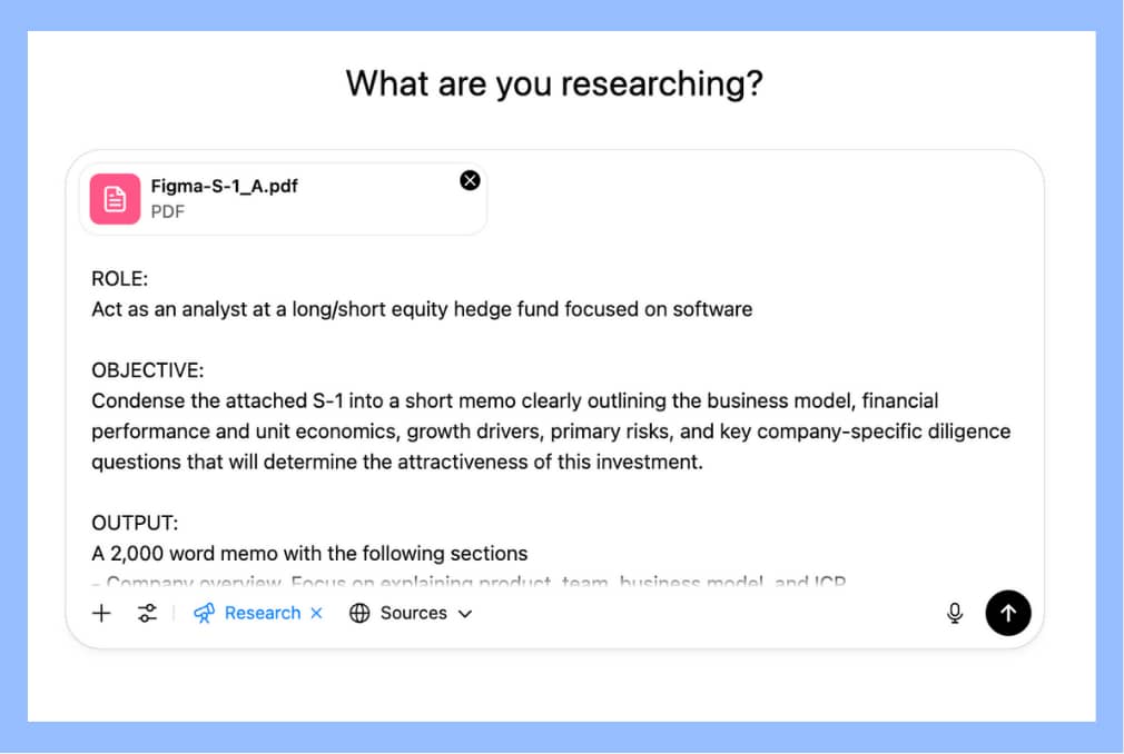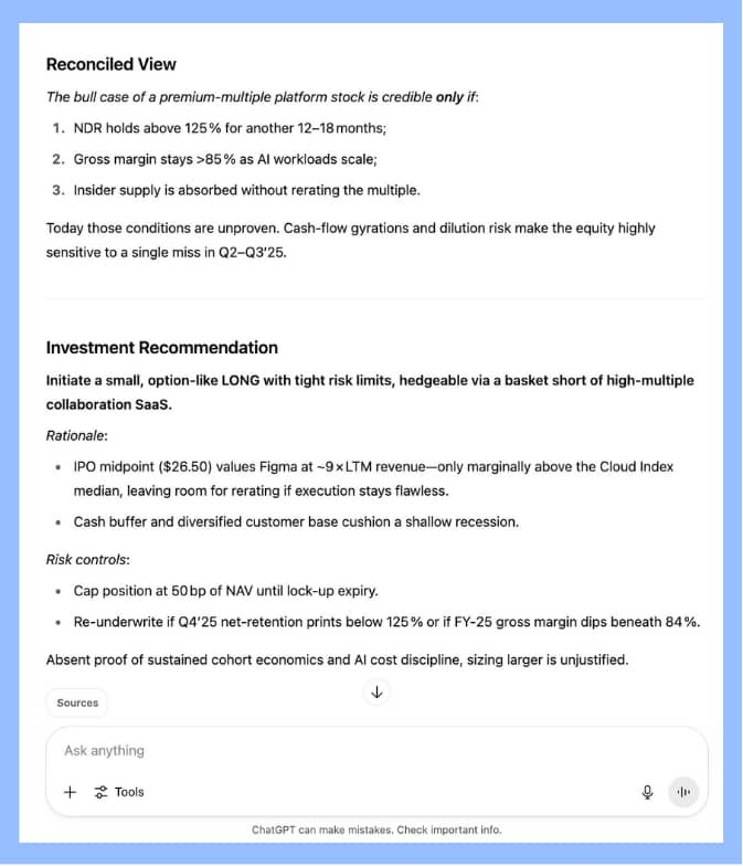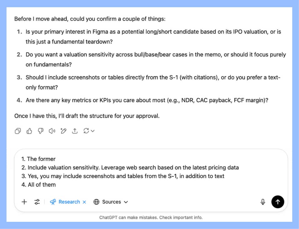 It's almost the same principle as sending comments to your team- you iterate until you have something that works. The difference is the AI works much faster and isn't afraid to ask you for clarification. This is how you get from the AI slob we've been accustomed to in the past years to institutional-grade materials that are actually helpful. Example 1: Turning an S-1 into a Three-Page IC MemoFigma just launched its IPO roadshow- big news for capital markets. For your analysts, this implies reading their 200-page S-1 and briefing their PM ahead of the investment committee. Here’s how you deploy context engineering: ROLE: Act as an analyst at a long/short equity hedge fund focused on software OBJECTIVE: Condense the attached S-1 into a short memo clearly outlining the business model, financial performance and unit economics, growth drivers, primary risks, and key company-specific diligence questions that will determine the attractiveness of this investment. OUTPUT: A 2,000 word memo with the following sections - Company overview. Focus on explaining product, team, business model, and ICP - Industry and market overview. Explain the industry dynamics, market sizing (including how it is derived), competitive universe, market segmentation - Financial and unit economics overview. Show main financial figures (users, revenue, margins, etc.) and unit economics (including key SaaS metrics). This list is not exhaustive, and you should feel free to include others. Provide commentary explaining the story behind the numbers - Key diligence questions specific to the company. Provide questions and answers. - Investment thesis and risks, with high-level description of bull/base/bear case scenarios. Based only on what you know from the provided input document, provide an investment recommendation. CONTEXT: - Audience: a portfolio manager at the same hedge fund who likes to understand specific nuances, but also get high-level "so-what" insights - Voice & Tone: Hard-nosed, factual, zero marketing fluff. Explanation-rich sentences, meaning detailed and clear enough to fully articulate the reasoning behind each point. - Length Target: Approximately 2,000 words - Must-Use Inputs:Attached S-1 filing for Figma - Constraints:Cite every numerical figure with page numbers. No speculative, forward-looking hype.All data must be backed up by the attached S-1 filing. Do not draw from any other sources STEPS: 1. Gap check - list any information or context that is still missing. Ask me concise questions until the gaps are filled 2. Plan - outline a logical structure or bullet agenda for the piece. Wait for my approval 3. Draft - write the first version following the approved plan 4. Review - pause and ask me for feedback on clarity, tone, completeness, and general direction 5. Revise - iteratively improve the draft with your comments See how it works. Using ChatGPT o3, I attached the PDF of Figma's S-1 + activated "Deep Research". Then you must answer ChatGPT's questions so that it has appropriate context: And now ChatGPT will take care of the research and drafting on your behalf. Example 2: Finding Blind Spots in Your AnalysisSuppose you've drafted your memo and now want an independent voice to challenge your assumptions. Here’s how to leverage the AI as your internal risk manager: ROLE: Act as a contrarian risk manager whose mission is to stress-test my thesis. OBJECTIVE: Identify critical blind spots, missing data, and hidden downside risks in my memo. OUTPUT: A 600 word assessment with detailed explanations as to where investment thesis, risks, and recommendation in the memo could be right or wrong. CONTEXT PACKAGE: - Audience: CIO or PM who despises unwelcome surprises. - Voice & Tone: Sharp, critical, authoritative. - Length Target: Under 600 words-brief yet brutally honest. - Must-Use Inputs:My original memo draft.The complete S-1 filing. - Constraints:Avoid generic risks; specify page numbers or exact metrics for each identified gap. WORKFLOW: 1. Gap check - list any information or context that is still missing. Ask me concise questions until the gaps are filled 2. Plan - outline a logical structure or bullet agenda for the piece. Wait for my approval 3. Draft - write the first version following the approved plan 4. Review - pause and ask me for feedback on clarity, tone, completeness, and general direction 5. Revise - iteratively improve the draft with your comments Having a second run at the LLM with a "find my blind spots" prompt - loaded with the prior context, its last output, and your new inputs - will produce far more critical, zero‑fluff insight Here's the full chain of analysis: https://chatgpt.com/share/687f1478-39e4-8007-892b-366bce3bd02e When Not to Use ContextIs detailed context always necessary? No. Context engineering shines brightest in complex, high-stakes analysis: situations requiring nuanced understanding, careful reasoning, or risk assessments. But when you need quick, factual, straightforward responses, go ahead and fire off a simple, context-free prompt.